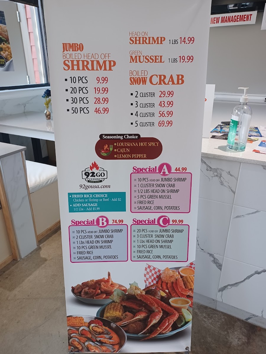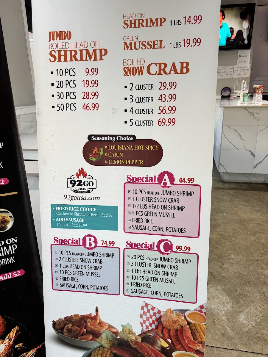 Welcome to 92 go, a culinary gem located at 811 S Irby St, Florence, SC. Known for its vibrant atmosphere and exceptional service, 92 go offers a dynamic menu that caters to all seafood enthusiasts and comfort food lovers alike. Their All Day Menu spotlights a range of succulent seafood specials, such as the mouthwatering Special C—20 pieces of head-off jumbo shrimp, snow crab clusters, and an aromatic fried rice medley. Whether you opt for the shrimp combo paired with crispy fries or the delightful fish combo, each dish bursts with flavor.